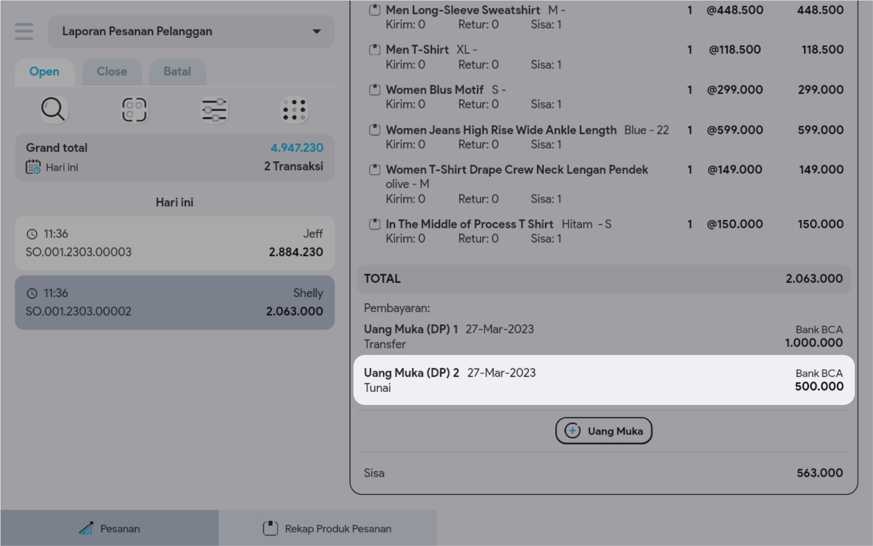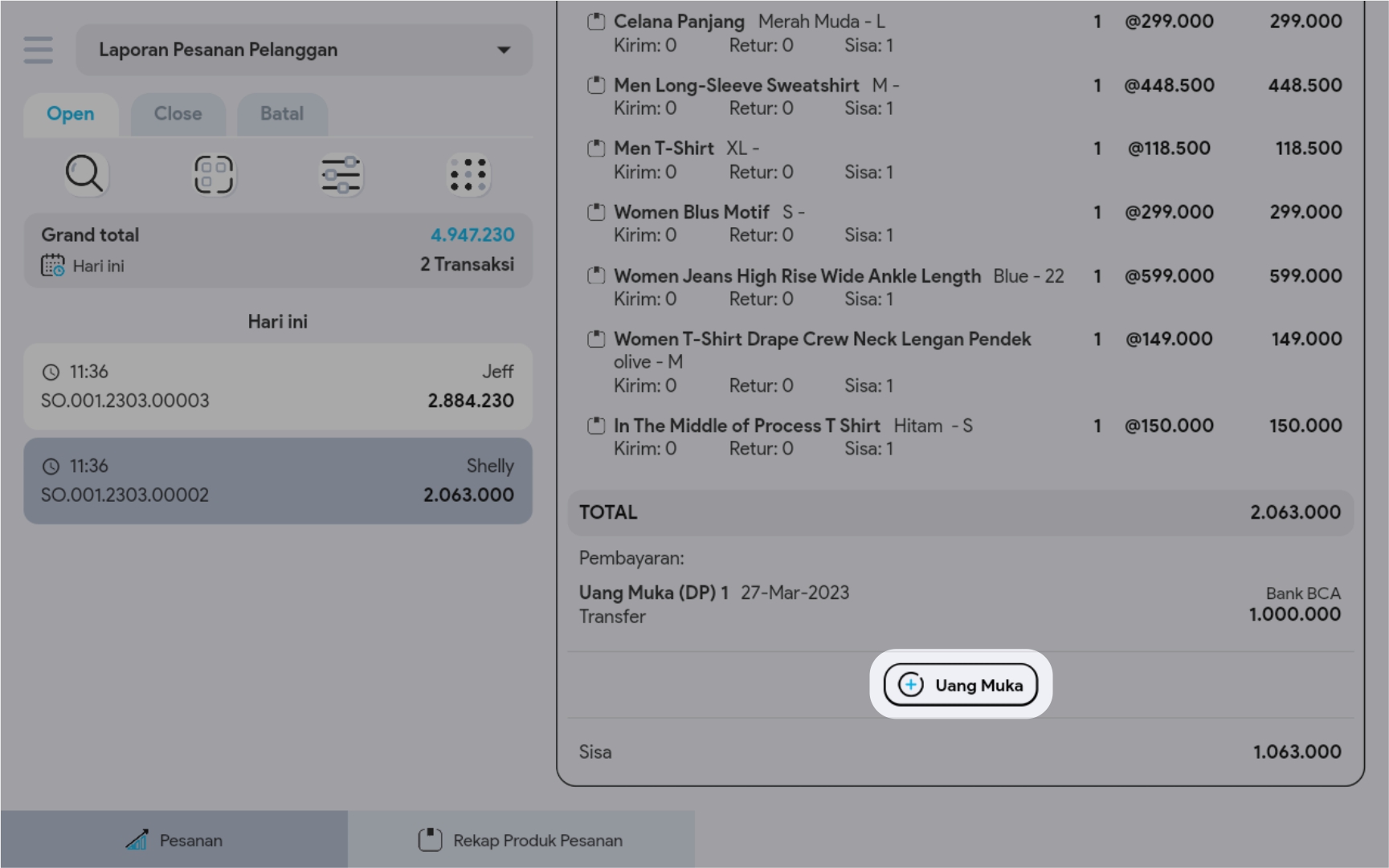 4. Di halaman detail, klik button + Uang Muka