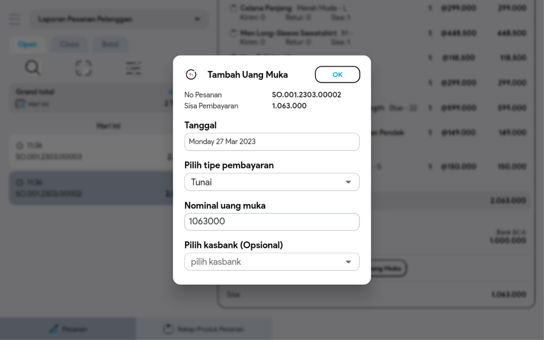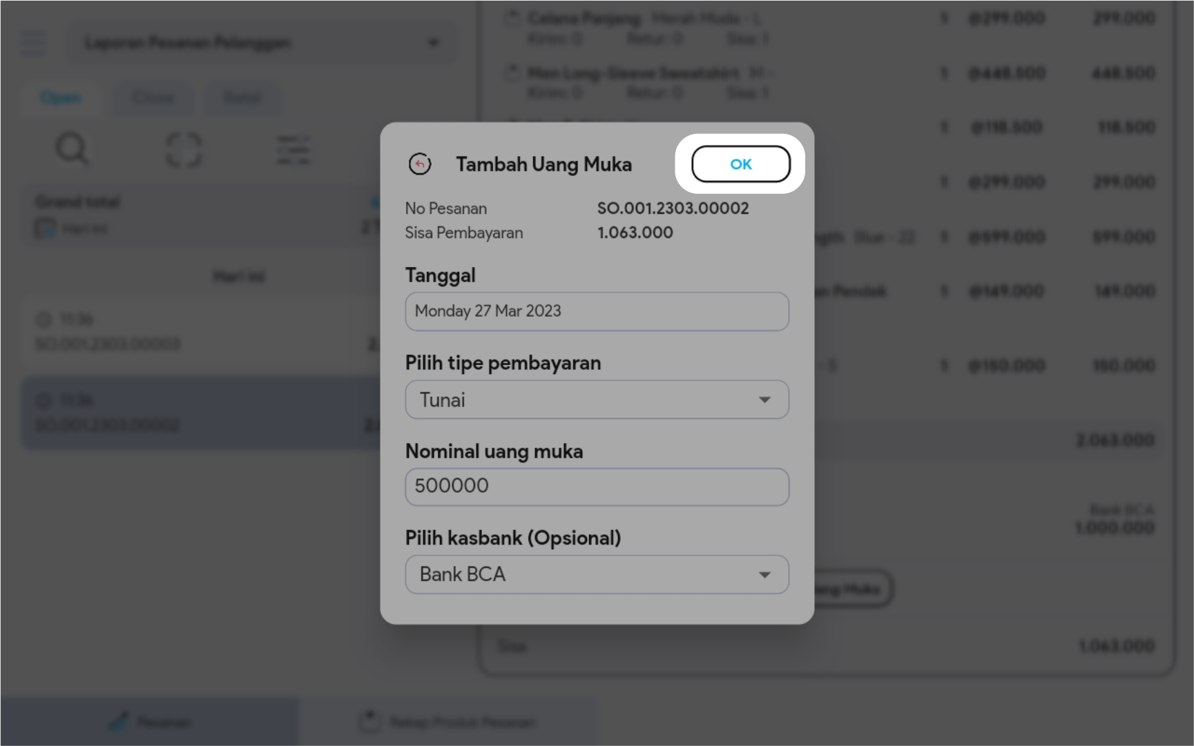 6. Klik button OK dan uang muka berhasil ditambahkan