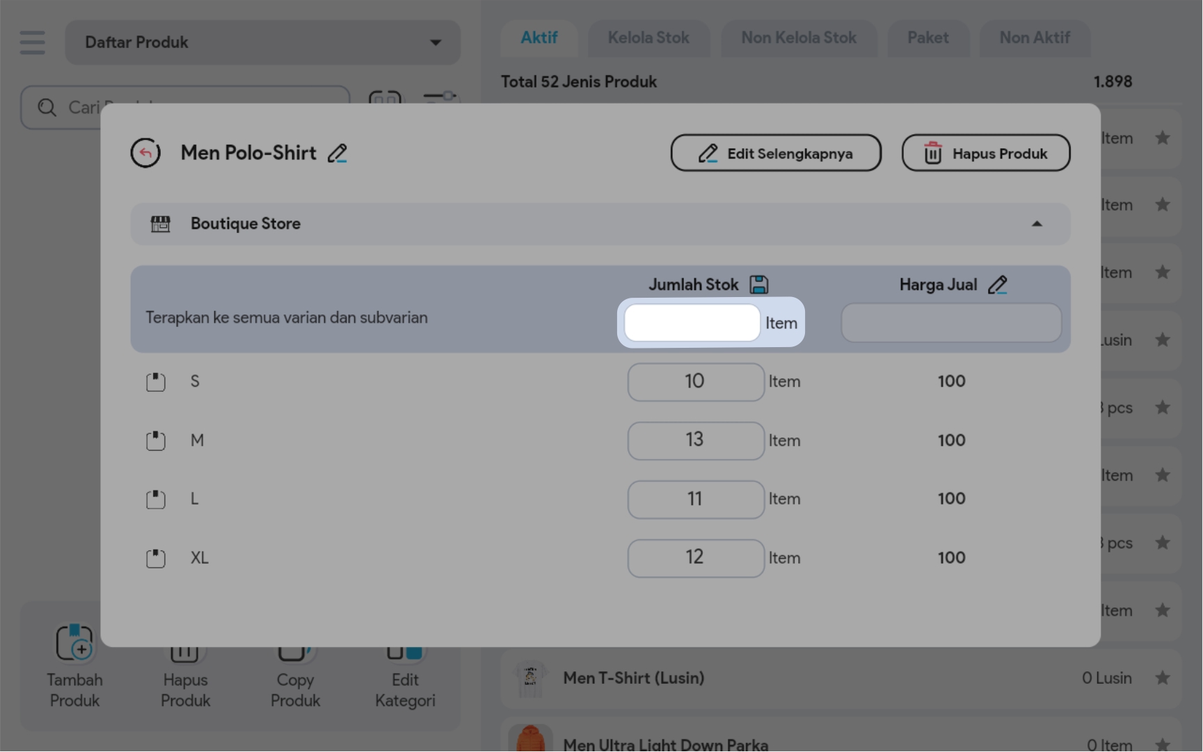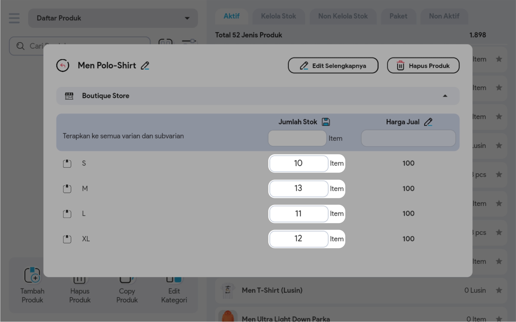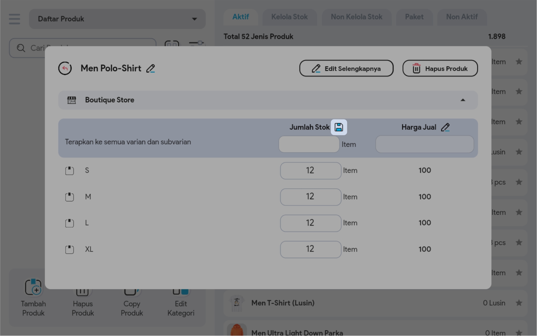 6. Atau Anda bisa melakukan input cepat untuk semua varian dan subvarian, dengan mengisi data produk pada box biru seperti yang tertera di gambar