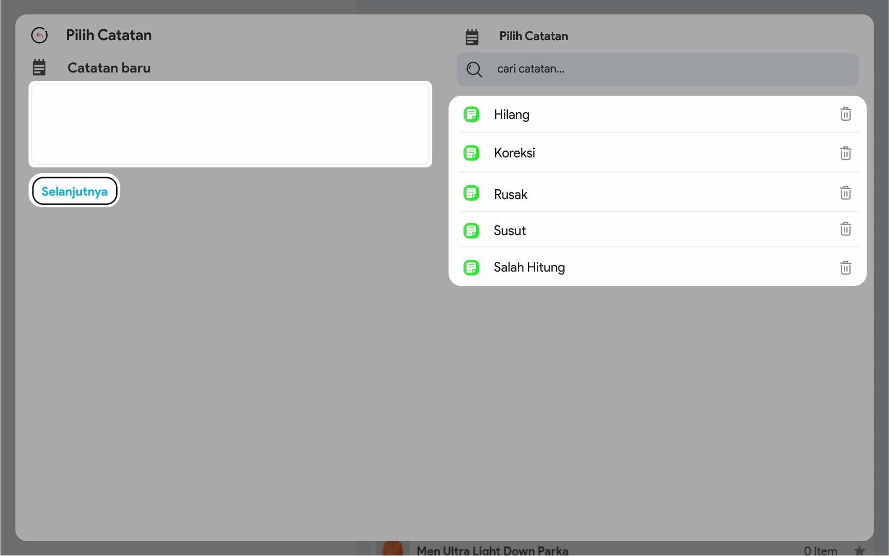 9. Pilih alasan perubahan quantity stok. Anda dapat membuat alasan baru dan menyimpan alasan tersebut atau menggunakan alasan yang sudah tersimpan sebelumnya.