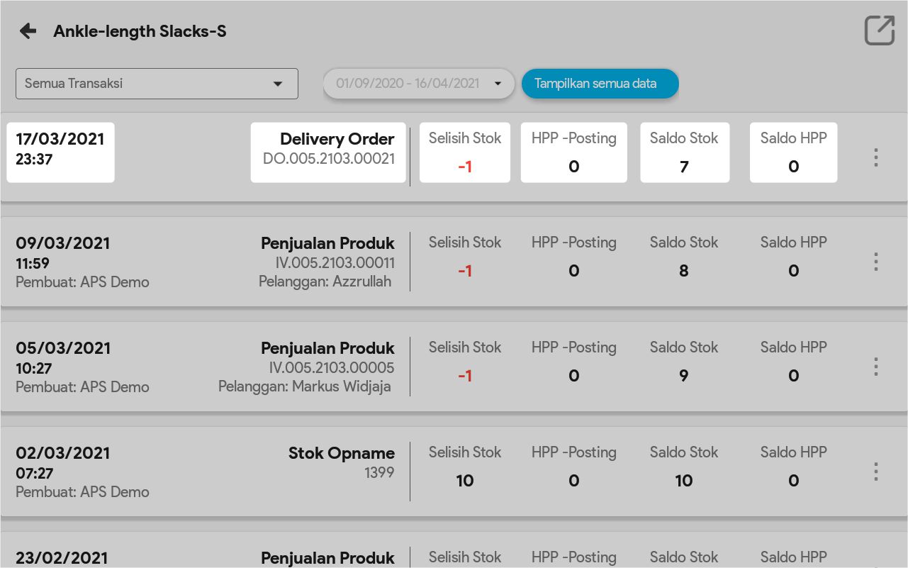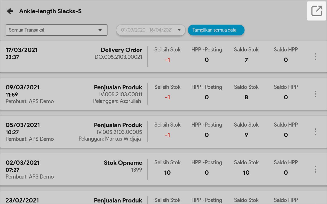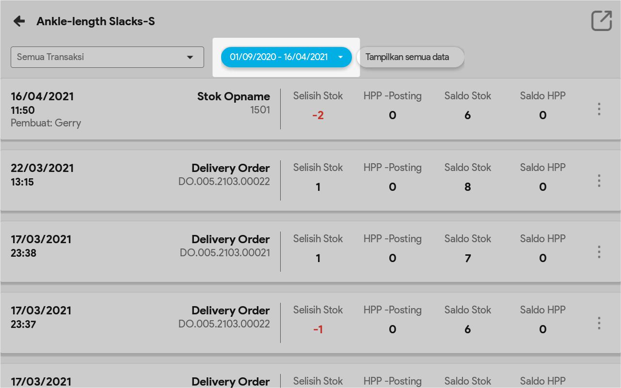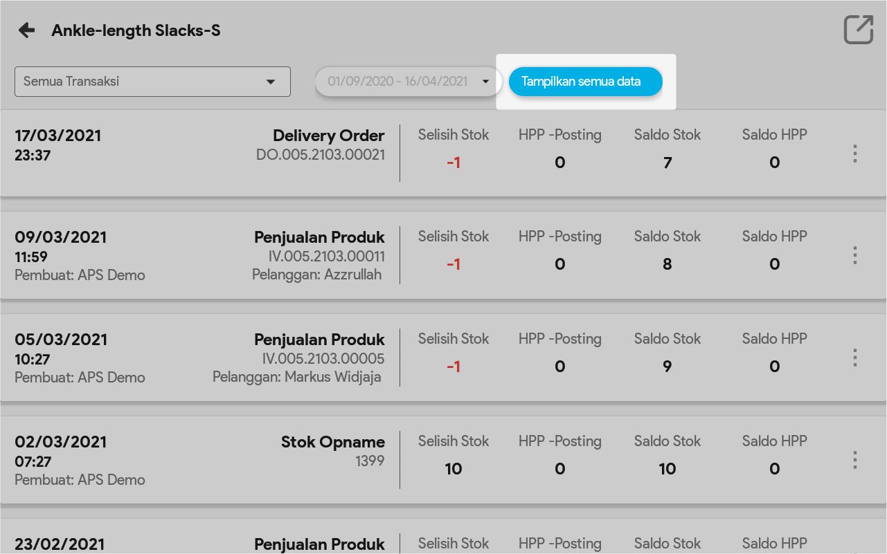 8. Pilih Tampilkan Semua Data bila ingin melihat semua pergerakan produk tersebut, dari sejak tanggal awal produk ada sampai tanggal sekarang