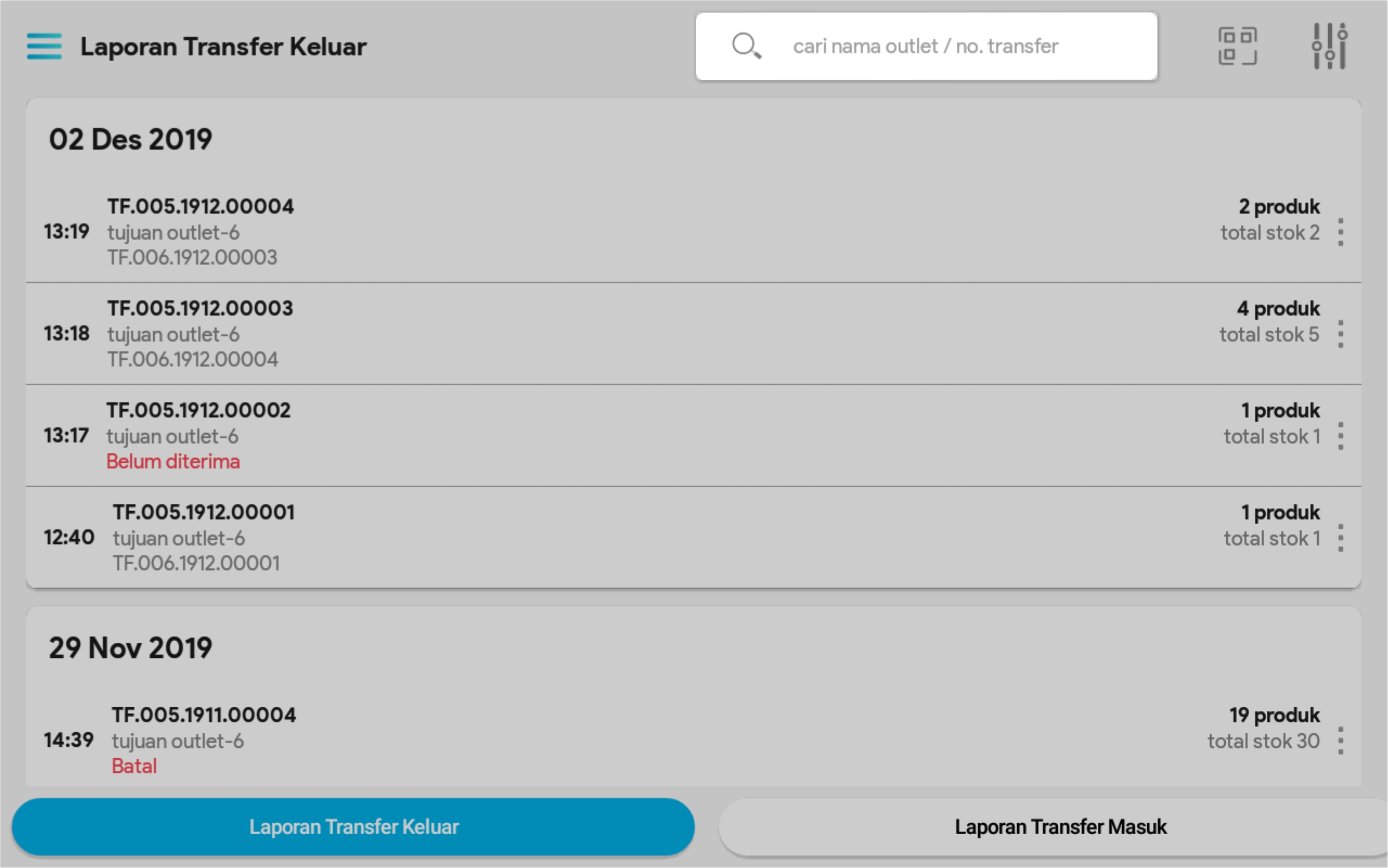 3. Masukkan no transfer keluar pada kolom pencarian, scan barcode no transfer keluar atau gunakan filter untuk mempermudah