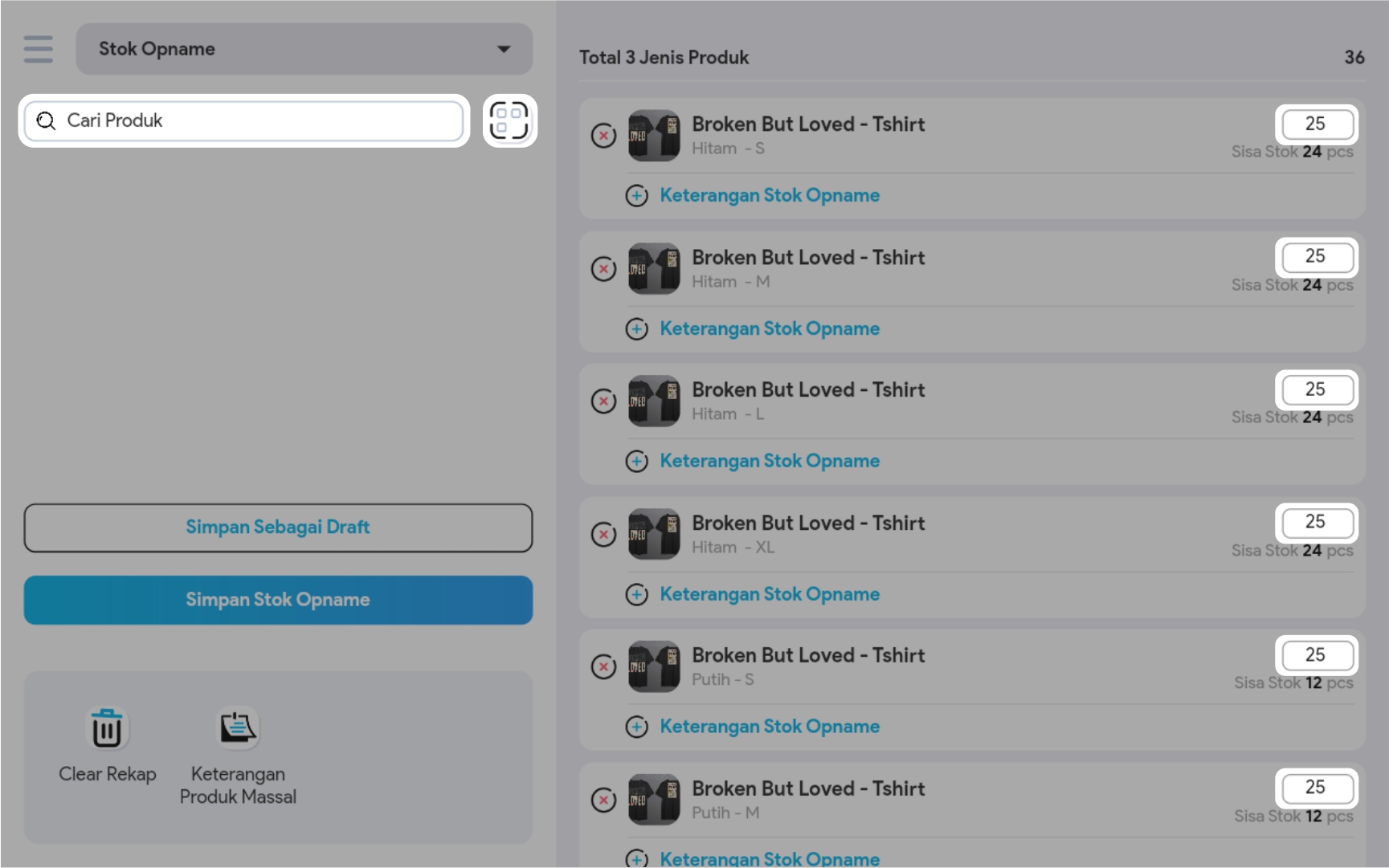 6. Silahkan ubah data stok yang ingin Anda perbaiki, atau Anda dapat menghapus dan menambah produk yang ingin diinput.